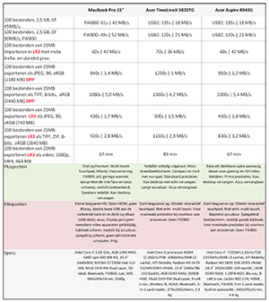 Ondanks dat de Acer's redelijk solide en modern uitgevoerd zijn, is de degelijkheid en het design van het MacBook Pro onovertroffen. Als we overschakelen van het MacBook Pro naar de Acer's is ook meteen het verschil in het werken met de touchpad duidelijk. Ook hier 'wint' de Mac. Beide pluspunten zijn interessant, maar uiteindelijk gaat het toch om de prestaties. We hebben 100 RAW-bestanden van een EOS 7D van elk 25 MB in een workflow van Lightroom opgenomen van downloaden, importeren, exporteren en een video maken. Dankzij de FW800 laat het MacBook de Acer's ver achter zich bij het downloaden vanaf een kaartlezer. Als de bestanden echter op de harde schijven van de drie notebooks staan, dan worden de verschillen kleiner en meer spec-gerelateerd. De TimelineX is dan met zijn 'tragere' processor in alle gevallen ongeveer 20% langzamer dan de twee Intel i7 modellen. De Acer Aspire 8943 en het MacBook Pro 15” geven elkaar in snelheid niets toe. Dat bewijst dat een Mac ook maar een 'gewone' computer is. Het overschot aan intern geheugen van de Aspire 8943 komt pas tot zijn recht bij uitgebreide multitasking met meerdere openstaande programma's. In de tabel tref je alle resultaten, waaronder ook enkele metingen vanuit Digital Photo Professional (DPP).