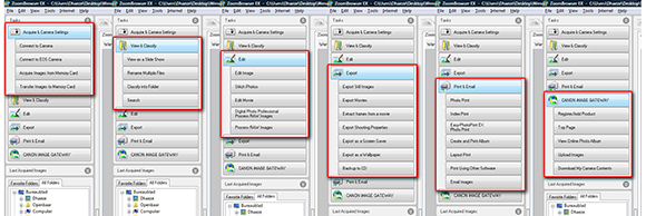 ZoomBrowser EX (mac: ImageBrowser) doet zijn naam geen eer aan. Je denkt dat je er alleen maar mee door foto's kunt bladeren. En als je het programma opstart, dan bevestigt de interface deze eerste gedacht. Als je echter even verder kijkt, dan is het een duizendpoot en is de functionaliteit zo uitgebreid, dat we er vele artikelen aan zouden kunnen besteden. Aangezien de werking voor zich spreekt, beperken we ons hier tot een korte opsomming aan de hand van het takenpanel aan de linkerzijde.