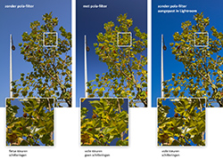 Maar ook filters kunnen bij veel onderwerpen bijdragen in verbetering van de belichting of beeldkwaliteit. Voor landschapsfotografie is een grijsverloopfilter onmisbaar (overbruggen hoog contrast) en bewijst een circulair polarisatiefilter goede diensten (betere kleuren en contrast). Beide filters zijn besproken in EOSzine 0906 met illustratieve videoclips. Een accessoire dat nogal eens onderschat wordt is een zonnekap op de lens. Ten eerste beschermt hij de frontlens tegen stoten en regen, maar ook zorgt hij voor een contrastrijker beeld. Vergelijk het met een situatie waarin je op een zonnig zandstrand last hebt van overstraling en je je hand boven je ogen houdt om beter te kunnen zien. Dat is ook wat een zonnekap doet. Zonnekap en polafilter mogen dus niet in je koffer ontbreken als je op safari gaat naar Afrika.