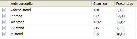 Hierop hebben we 2929 reacties gehad. Hieronder zie je daarvan de resultaten en die zijn redelijk volgens verwachting. De P- en Av-stand zijn het meest gebruikt, maar ons valt op dat toch relatief veel fotografen in de M-stand werken. Wij vragen ons af waarom? Werken zij in de studio? Doen ze veel nachtfotografie?