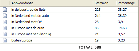 Hierop hebben we 588 reacties gehad. Hieronder zie je daarvan de resultaten en die zijn redelijk volgens verwachting. We blijven toch vooral in de buurt en dus scoort Nederland hoog met 80%. Het is ook een prachtig land om mooie foto's te maken.
