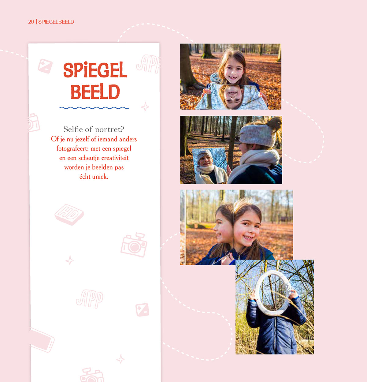 In het boek ‘Zeg eens cheese, de beste fotografietips voor kinderen’ wordt op een eenvoudige manier uitgelegd want composities zijn. Je ontdekt hoe leuk fotografie is, maar vooral hoe mooi de wereld om je heen eigenlijk is. Met handige tips, leuke opdrachten en geheime trucjes kan jezelf aan de slag. Voor wie zich helemaal kan vinden in het uitleven en experimenteren met een fototoestel, is ‘Fotogenie, tips voor magische fotografie’ een echte aanrader. Je gaat op avontuur in je eigen creativiteit. Je ontdekt de magie van de natuur en de magie van je eigen verbeelding. Je leert het wonderbaarlijke zien in alledaagse dingen. Je zet je eigen wereld op z’n kop, je maakt je eigen cameralenzen, je ontdekt niet alleen hoe mooi muziek klinkt maar ook hoe mooi muziek eruitziet, je speelt met een glazenbol en nog veel meer.