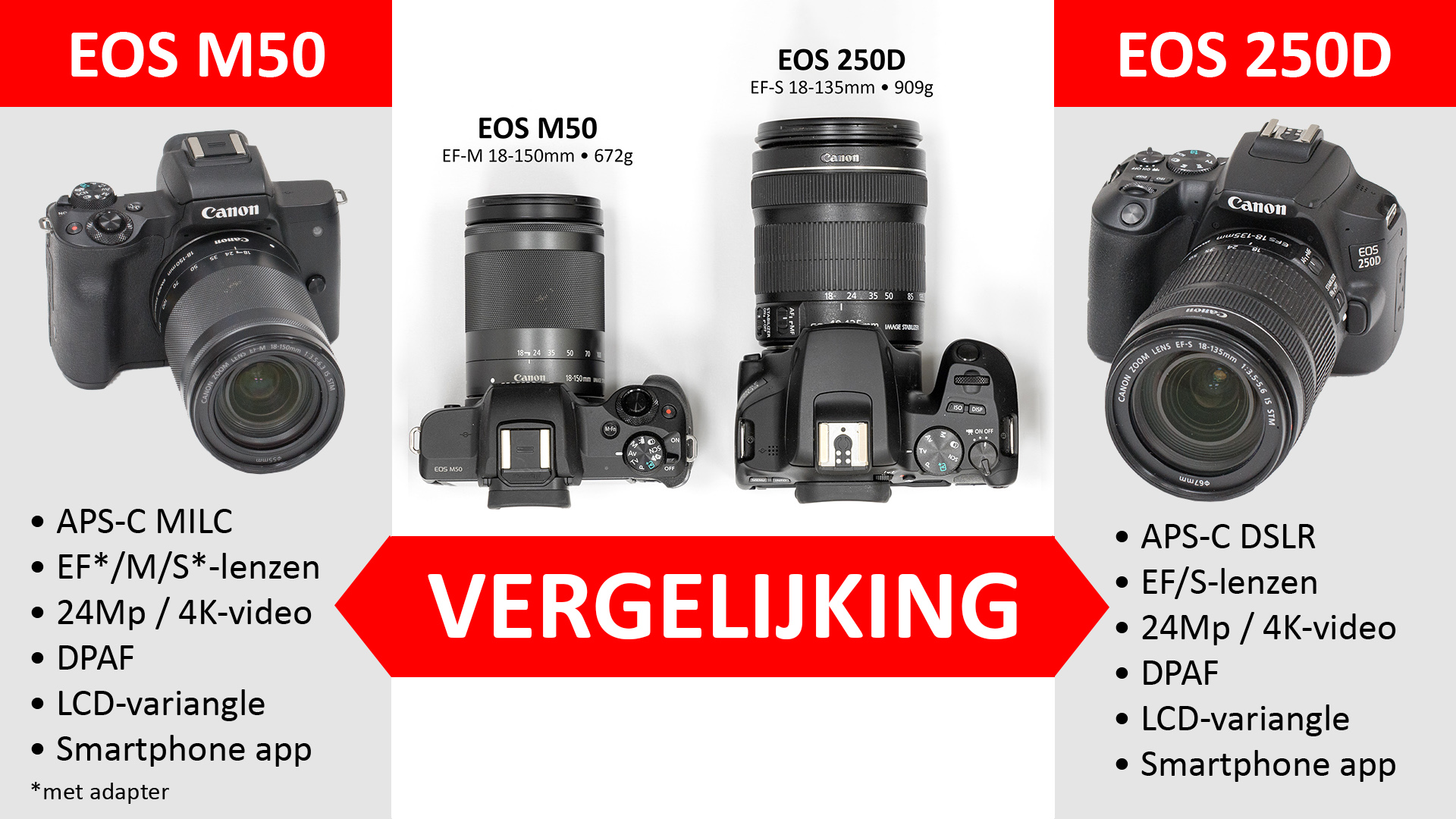 Een extra moeilijkheid was verder dat de camera’s voor wat betreft technische specificaties bijna identiek zijn en bovendien met een allround zoomlens (EF-S 18-135mm of EF-M 18-150mm) nagenoeg even duur zijn (ca. 850 euro). Door de vormfactor (DSLR versus MILC) zijn het echter toch wel heel verschillende camera’s als je ze in je handen hebt en er mee gaat fotograferen. Maar wat is nou dat verschil? En hoe leg je dat uit aan iemand die de camera’s niet naast elkaar kan gebruiken?