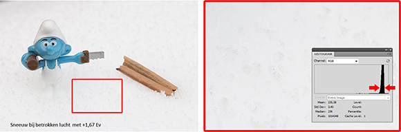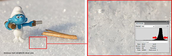 Als je dus van dichtbij met strijklicht sneeuw fotografeert, dan krijg je met de juiste hoeveelheid positieve belichtingscompensatie én de juiste helderheid én voldoende structuur. Aanpassing in Photoshop of Lightroom van plaats en breedte van de sneeuwpiek in het histogram is dan zelden nodig.