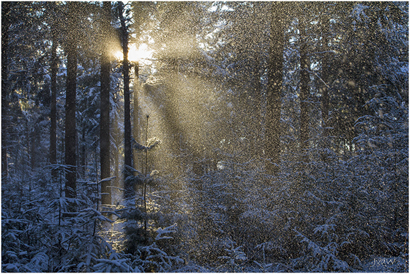 Onze jongste dochter vroeg gisteravond al of we vanochtend foto's konden gaan maken in de sneeuw. Omdat ik de hele zaterdag al had rondgesjouwd in de Drunense Duinen had ik eigenlijk plannen die meer richting uitslapen gingen, maar uiteindelijk stonden we toch om kwart over 9 in een vrijwel leeg, sprookjesachtig bos! Wat een sfeer! Op werkelijk ieder takje lag sneeuw en de zon scheen daar nog eens prachtig doorheen. We liepen naar een stuk bos waar ik bovenstaande foto wilde maken. De foto zat als 'plaatje' al wel in m'n hoofd, maar werd véél krachtiger doordat er af en toe sneeuw van de bovenste takken werd afgeblazen door de wind! Het was net goudkleurige confetti die naar beneden dwarrelde; krijg ik toch nog een carnavalsgevoel :)!