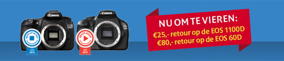 De Canon EOS 1100D en de Canon EOS 60D zijn onlangs uitgeroepen tot respectievelijk Beste Koop en Beste uit de Test van de Consumentenbond. Om dit te vieren heeft Canon een speciale cashback opgezet voor deze twee camera's!