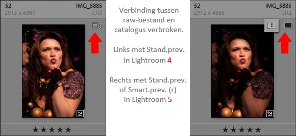 Is de koppeling tussen de catalogus en de fysieke bestanden echter verbroken, omdat de harde schijf ontkoppeld is, dan kun je de foto’s nog wel zien (zijnde de jpg-previews), maar je kunt ze niet bewerken. Dat de koppeling verbroken is, kun je dan zien aan het vraagtekentje boven de miniaturen.