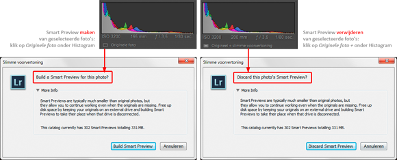 Tip Je kunt Smart previews laten aanmaken door deze optie aan te vinken bij het importeren van raw-bestanden, maar je kunt het ook achteraf nog doen. Selecteer de betreffende foto(‘s) in de module Bibliotheek en klik onder het Histogram aan de rechterzijde op de tekst Originele foto. In het volgende dialoogvenster kun je deze handeling afronden. Wil je juist Smart previews verwijderen, selecteer dan weer de betreffende foto(‘s) en klik nu op de tekst Originele foto en slimme voorvertoning, waarna je de actie kunt bevestigen. |