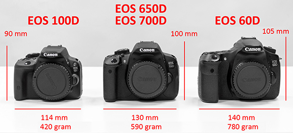 Het spectaculaire nieuws van de EOS 100D ligt in zijn ontwerp en de uitvoering. Het is op dit moment de kleinste en lichtste DSLR van de wereld. Het is een ongelooflijke prestatie van de ontwerpers van Canon dat ze een spiegelreflex hebben kunnen maken (420 gram, ca.450 cm3) die hetzelfde formaat sensor, lcd-scherm en spiegelhuis heeft als de EOS 650D/700D (590 gram, ca.570 cm3) en EOS 60D (780 gram, ca.650 cm3), terwijl het volume van de EOS 100D respectievelijk 20% en 30% kleiner is en het gewicht 30% en 45% minder is. Het is dus echt een cameraatje en met de nieuwe EF-S 18-55mm STM weegt deze combi nog geen 610 gram!