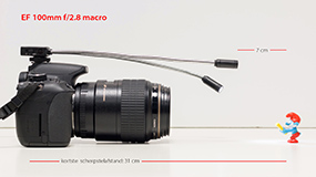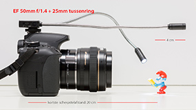 De flexibele tentakels zijn ongeveer 23 cm lang en als ze op onze EOS 650D staan, dan steken ze 9 cm over de voorkant van een EF 100mm macrolens. De afstand van de lampjes met gestrekte armpjes tot de kortste scherpstelafstand van die lens licht dan nog 7 cm verder. Je verliest bij zo’n ‘lange’ lens met ‘grote’ scherpstelafstand al aardig wat licht en als je bovendien de richting van de lampjes wil veranderen, dan wordt het lichtverlies nog groter. Bij een EF 50mm f/1.4 lens met 25mm tussenring heb je dat probleem niet en steken de armpjes 13 cm voorbij de lens, terwijl de kortste scherpstelafstand 20 cm is. De lampjes reiken dan 4 cm verder dan het onderwerp en je kunt ze nu zonder problemen op elke afstand en onder elke hoek op het hoofdonderwerp richten. Ook bij een EF-S 60mm f/2.8 zijn de LED-armpjes lang genoeg om het LED-licht heel gecontroleerd te sturen (afbeelding).De kleurtemperatuur is ongeveer 5200 tot 5500 K, dus prima te combineren met daglicht.