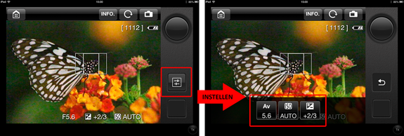 | Live-viewbeeld op smartphone/tablet (l) en de mogelijkheid om daarop instellingen aan te passen. |