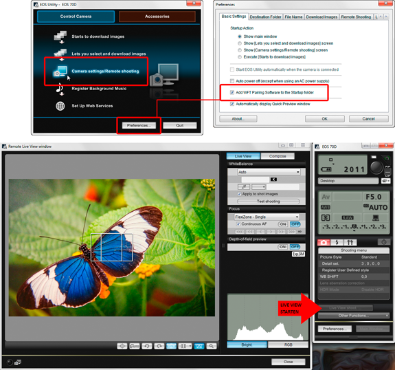 • Start nu EOS Utility, klik op Camera settings/Remote shooting (moet wit zijn) en er verschijnt een controlepaneel op je computer. Om ook het zoekerbeeld op het beeldscherm te zien, klik je op de optie Live View shoot.