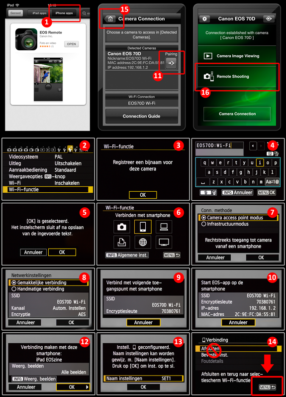 Stapsgewijs de EOS 70D draadloos verbinden met smartphone/tablet en bedienen met EOS Remote.