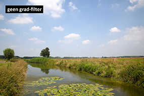 Bij veel zon heb je niet alleen veel spiegeling, maar ook veel contrast. Het is dan niet eenvoudig om een heldere lucht en een uitgestrekte voorgrond beide goed belicht te krijgen. Of de voorgrond is goed belicht, maar de lucht overbelicht of de lucht is goed belicht, maar de voorgrond te donker. Je kunt dit natuurlijk oplossen in Photoshop, maar ook al tijdens de opname bestaat de mogelijkheid om in één opname een goed belichte foto te maken. Een grijsverloopfilter (grad-filter) is hierbij het aangewezen accessoire. Het principe en de uitvoering van zo’n filter zijn simpel, doch doeltreffend. Door het licht van een heldere lucht tegen te houden en die van de voorgrond ongemoeid te laten, kan een opname van een contrastrijk landschap in één keer goed belicht worden. Dit kan worden bereikt met een glazen plaatje wat aan de bovenzijde grijs is en halverwege verloopt naar geheel transparant. De dichtheid (ND, density) van de grijze bovenzijde kan variëren en ook het verloop van grijs naar helder kan verschillen van scherp (Hard) tot zeer geleidelijk (Soft). Zo heb je voor elke situatie een geschikt grad-filter. Er zijn zelfs soorten waarbij grijs vervangen is door een kleur en zo kun je een lucht nog blauwer maken of een zonsondergang meer oranje.