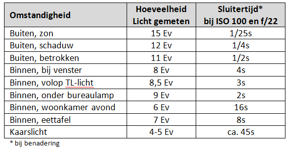 Lage ISO’s en relatief kleine diafragma’s. Dat is het recept om lange sluitertijden toe te kunnen passen en binnen lukt dat dus vaak zonder hulpmiddelen. Maar is dat toereikend als je overdag buiten aan het fotograferen bent? Op een betrokken dag (11 Ev) kom je met f/22 en ISO 100 dan tot maximaal een halve seconde. Dat is leuk voor een stromend beekje of een fontein, maar langzame beweging van wolken en waterrimpeling strijk je daarmee niet glad. Schijnt de zon, dan wordt de situatie voor lange sluitertijden nog slechter. De lichthoeveelheid stijgt dan met 3 à 4 stops (14-15 Ev) en wordt de sluitertijd nog ongeveer 10x zo kort tot circa 1/20s. In de onderstaande tabel grootte-orde overzicht van sluitertijden bij bepaalde lichthoeveelheden.