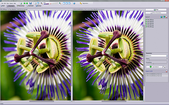 Bovenbeschreven methode geeft u als gebruiker de meeste controle over het eindresultaat, maar het vraagt een behoorlijke vaardigheid in een fotobewerkingsprogramma en ook veel tijd. Wilt u sneller, gemakkelijker en soms zelfs beter ‘focus stacken’, dan kunt u gebruik maken van een automatische functionaliteit in Photoshop CC. Dit programma is echter behoorlijk prijzig in aanschaf en als u alleen maar wilt Focus stacken, dan kunt u misschien beter een beroep doen op speciale ‘stapel’-software. De bekendste is Helicon Focus (shareware, $115) te vinden op www.heliconsoft.com. Dit programma hebben we gebruikt om close-upfoto’s (5x 12 Mp) van een passiebloem samen te voegen. Na installatie, openen van de foto’s, een klik op de knop Run en twee minuten wachten (standaard pc) krijgen we een naadloos en superscherp resultaat voorgetoverd, met de scherptediepte perfect goed tussen het achterste en voorste scherpstelpunt. De achtergrond is nog steeds vaag en het hoofdonderwerp spat haast letterlijk van het scherm. Het programma kan zelfs uit de voeten met RAW-bestanden voor een nog grotere detailweergave.