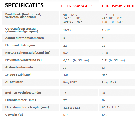 Is de centrumscherpte bij f=16mm hoog en nagenoeg gelijk bij de 4L IS en de 2.8L II, anders is dat met de hoekonscherpte. Ons exemplaar van de 2.8L II blijft zelfs bij f/8 onscherp, terwijl de EF 16-35mm 4L IS al vanaf f/4 stukken scherper is in de hoeken.