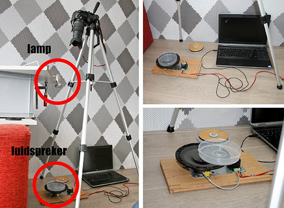 In de foto’s van de opstelling is te zien dat de luidspreker met het schaaltje op de grond staat. De camera en lichtbron staan daar recht boven ongeveer in elkaars lijn. Voor het beeld is de sluitertijd zeer bepalend. Omdat deze afhangt van de frequentie, moet je dit per situatie uitproberen. De beelden bij dit artikel (foto 01 t/m foto 08) zijn het resultaat van een paar avondjes experimenteren. De gebruikte camera is een Canon EOS 550D met een universele 18-200mm zoomlens..