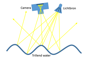 De gevoelige plaat legt het licht vast dat precies op het moment van het maken van de foto door het wateroppervlak van de lichtbron in de lens van de camera wordt gereflecteerd (afbeelding 01). Omdat een trillend wateroppervlak in beweging is zal slechts een deel van het wateroppervlak zo gericht zijn dat het licht in de lens reflecteert. En voilà we hebben een beeld van trillend water!
