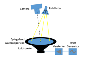 Afbeelding 02 toont de opstelling met daarin de belangrijkste elementen: een spiegelend wateroppervlak, een trillingsbron, een lichtbron en een camera.