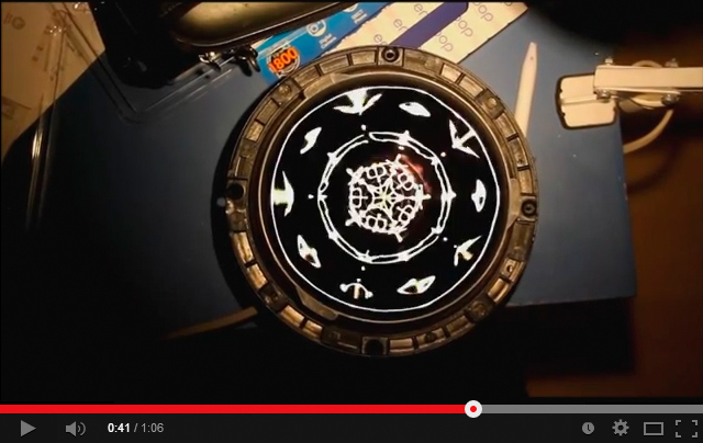 Mijn ervaring is dat trillingen in water interessante beelden produceren in de range tussen 10 en 20 Hz (trillingen per seconde). Dit zijn relatief langzame trillingen aan de ondergrens van wat we kunnen horen. Een luidspreker/versterker blijkt een prima instrument om in dit bereik trillingen te kunnen genereren. In de luidspreker wordt een schaaltje, zoals een deksel van een DVD-spindle, geplaatst of gekit waar een laagje water in kan staan (afbeelding 03). Om de trilling goed te volgen mag het schaaltje niet te zwaar zijn. Naast de luispreker/versterker is ook een toongenerator benodigd, die een constante toon levert. Een constante toon brengt het water in resonantie die karakteristiek is voor die toon en amplitude, en een krachtige golf oplevert. Bij muziek variëren de tonen vaak te snel zodat in het wateroppervlak slechts vluchtige golfpatronen ontstaan.