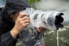Herfst en winter. Het kan in die seizoenen behoorlijk ‘spoken’ buiten en is het weinig uitnodigend om met de camera op pad te gaan. Toch zijn het vallen van het blad en een mooi - besneeuwd - winterlandschap fotogenieke onderwerpen. En net voor of na een hevige onweersbui kunnen licht en wolkenluchten spectaculair zijn. Reden genoeg om ook bij slecht weer de camera in de aanslag te houden. Maar dan wel goed beschermd, want regendruppels en sneeuwvlokken kunnen onder extreme weersomstandigheden het fotoplezier behoorlijk bederven. Vooral sneeuw is erg verraderlijk, want dit lijkt een ‘droge’ neerslag te zijn, maar als een vlokje op je camera of lens valt, wordt het bijna meteen een druppel en dringt het mogelijk via een knopje of klepje de camera in met alle gevolgen van dien. Maar ook met een stormwind op het strand of in de buurt van een waterval zweven er allemaal ongewenste waterdruppels in de lucht, die voor storingen aan camera en lens kunnen zorgen. Zelfs condens dat neerslaat in een dampig bos, kan in dat opzicht levensgevaarlijk zijn. En hoewel sommige camera’s en lenzen afgedicht zijn voor spatwater en stof, is het toch geen fijn idee om met je dure apparatuur onbeschermd in de stromende regen te staan.