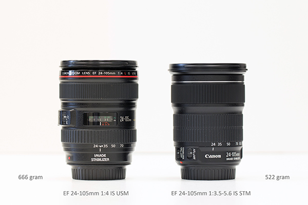 Omdat de EF 24-105mm STM minder lichtsterk is en geen L-predicaat heeft, is hij voelbaar lichter dan de EF 24-105mm 4L: 522 versus 666 gram. Dat is zeker op de EOS 6D een significant verschil en voelt de hele set bijzonder licht aan. De filtermaat van beide lenzen is 77mm.