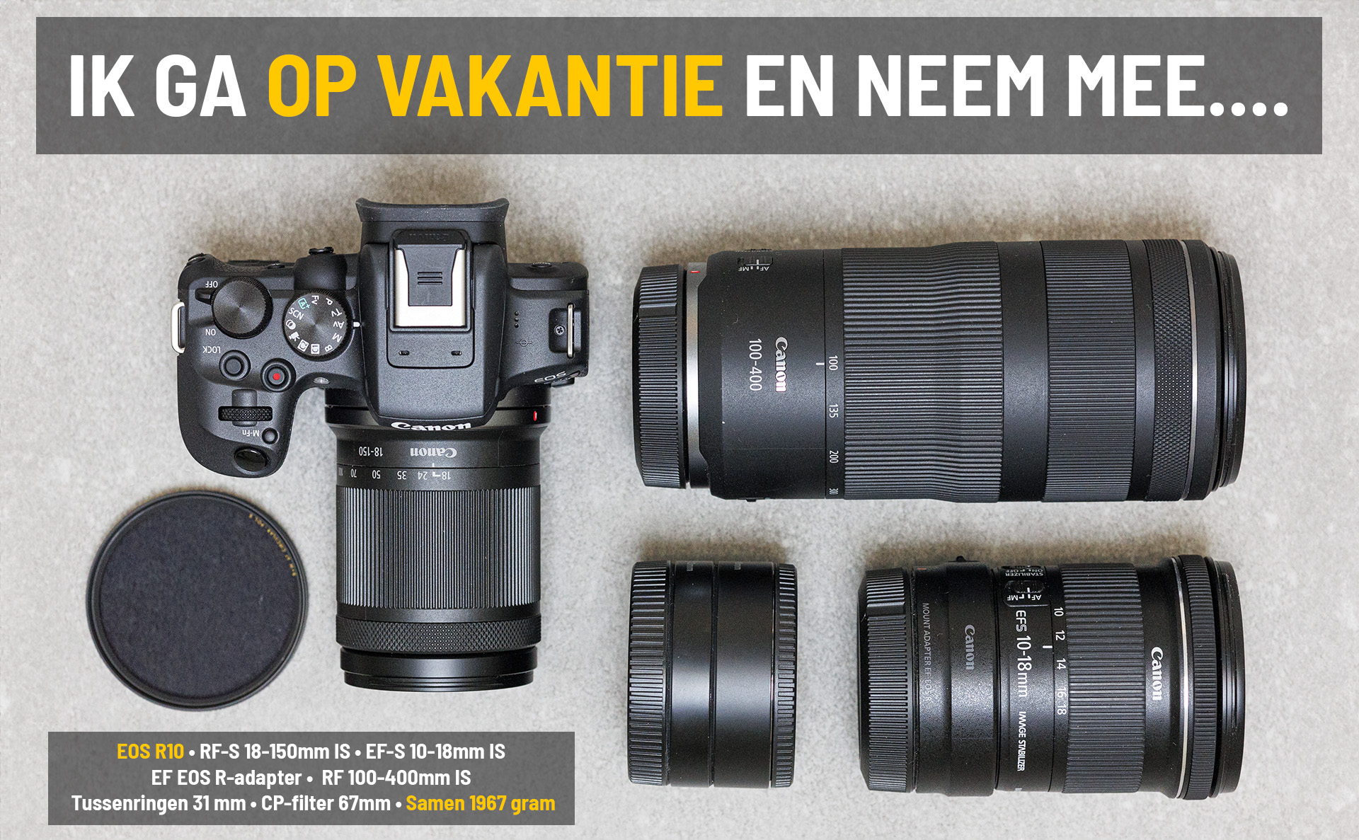 Deze keer wilde ik lichtbepakt op pad en na kort overleg met Canon zou de EOS R10 met de RF-S 18-150mm in ‘de koffer’ mee op reis gaan. Zelf heb ik daar nog de RF 100-400mm, de EF-S 10-18mm en twee tussenringen aan toegevoegd, zodat ik een brandpuntbereik van 16 tot 640mm (35mm-eq.) ter beschikking had.
