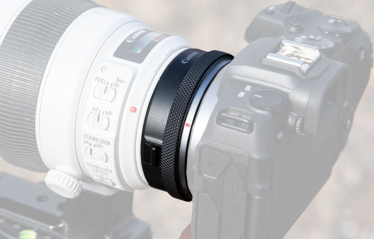 De Canon Mount adapter EF-EOS R met control-ring geplaatst tussen camerabody en lens.