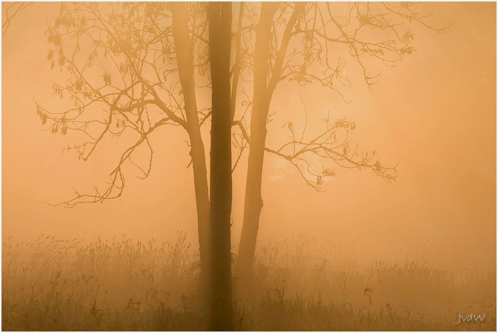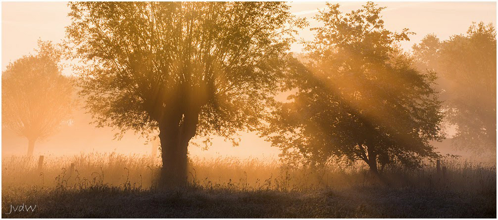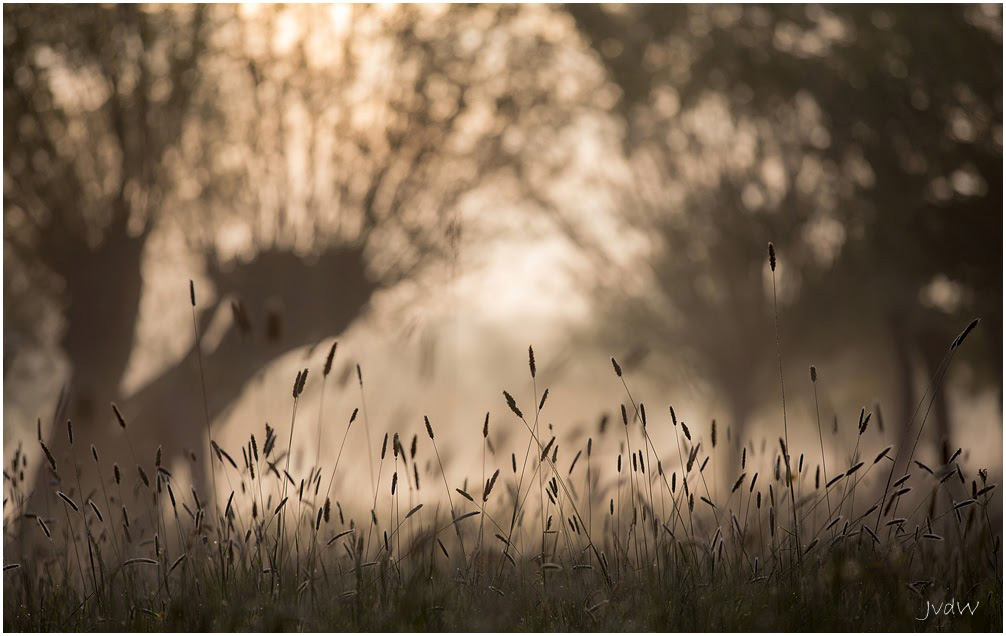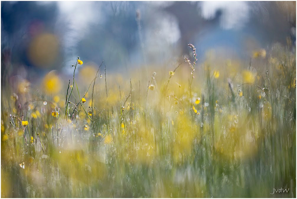 Hoe anders was het toen ik afgelopen zondagmorgen 'in de wei' stond (lag) tussen de boterbloemen; eigenlijk één grote chaos..! Dat was dus wel even schakelen en dat schakelen begon al toen ik aan kwam rijden. Ik was nogal laat, de zon was al op en het was (onverwacht) prachtig mistig bij het gebiedje waar ik wilde fotograferen. Ik was met macrobeelden in m'n hoofd thuis vertrokken en ben toen toch maar eerst met landschap aan de slag gegaan, maar dat viel niet mee. Ik zat daarbij flink te mopperen op mezelf omdat ik eigenlijk een half uur te laat was voor dit soort beelden.