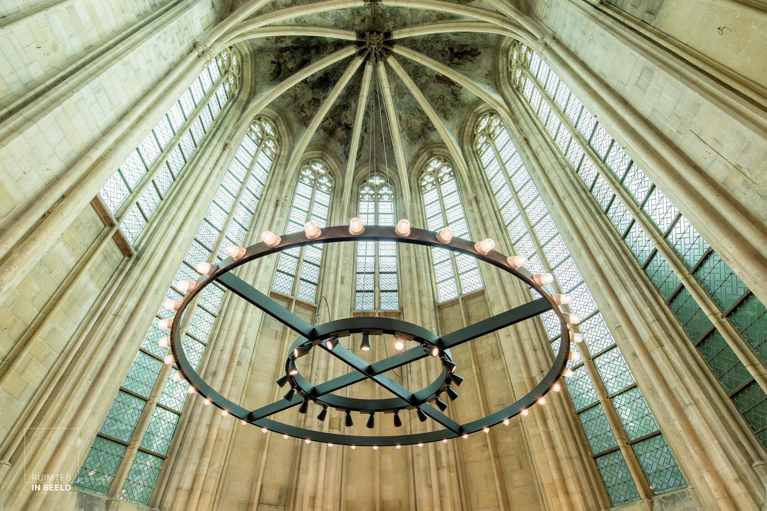 De kroonluchter vormt samen met de glas-in-lood ramen in de absis een fraai beeld.