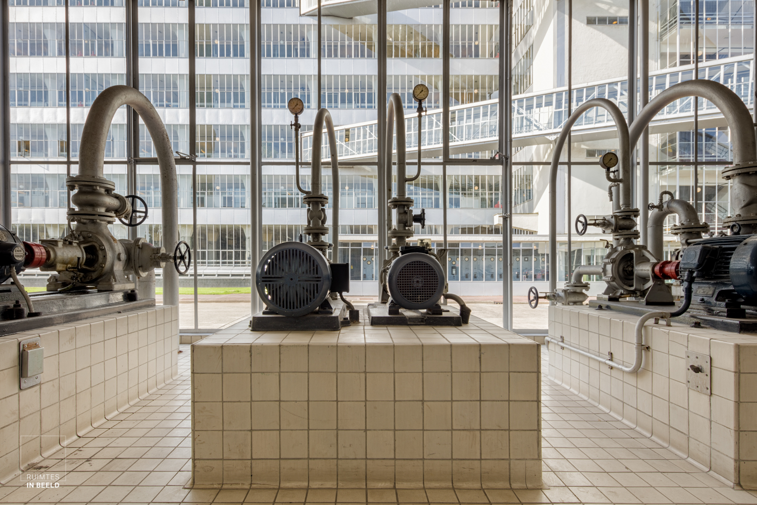 Oude machinekamers zijn sowieso geweldig om te fotograferen, maar bij de Van Nelle Fabriek komt er nog een dimensie bij. Naast de foto’s van oude machines, die een deel van de historie in zich bergen, kon ik ook de verbondenheid tussen de machinekamer en het hoofdgebouw in beeld brengen.