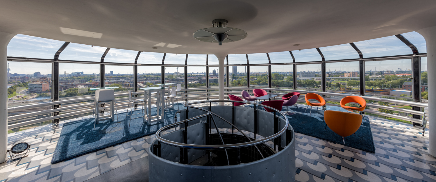 Boven óp het dak van de Van Nelle Fabriek bevindt zich een ronde, glazen koepel. De directie van Van Nelle heeft deze Tearoom ruimte vroeger laten bouwen om gasten te imponeren met het geweldige uitzicht. Bij mij lukte dat in ieder geval goed! Het uitzicht op de havens was echt geweldig. Kijk maar mee: