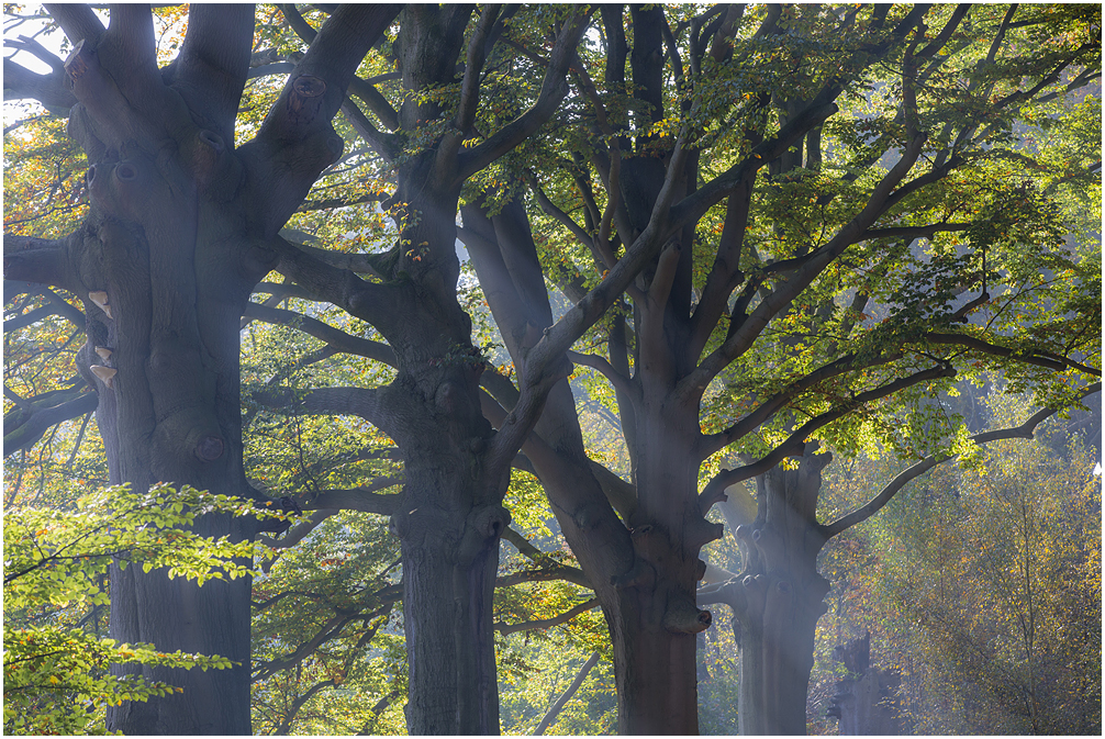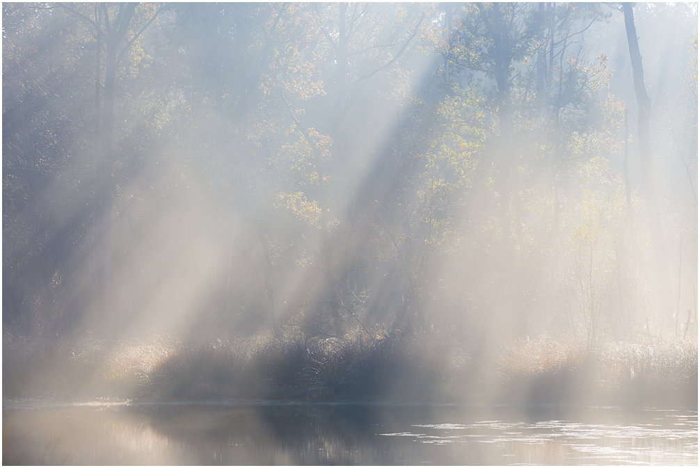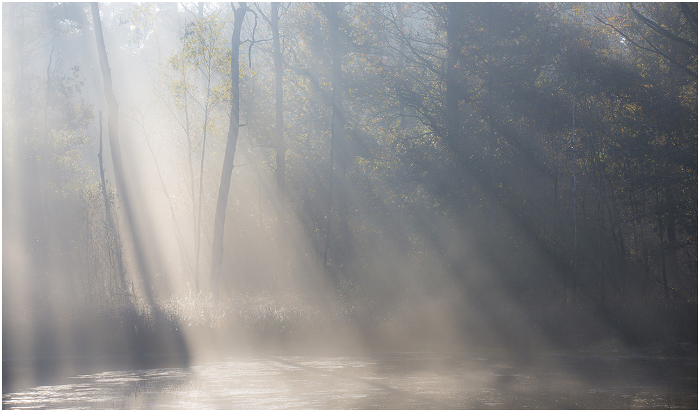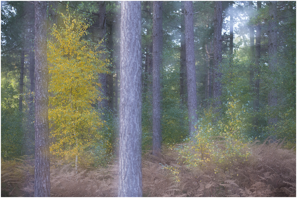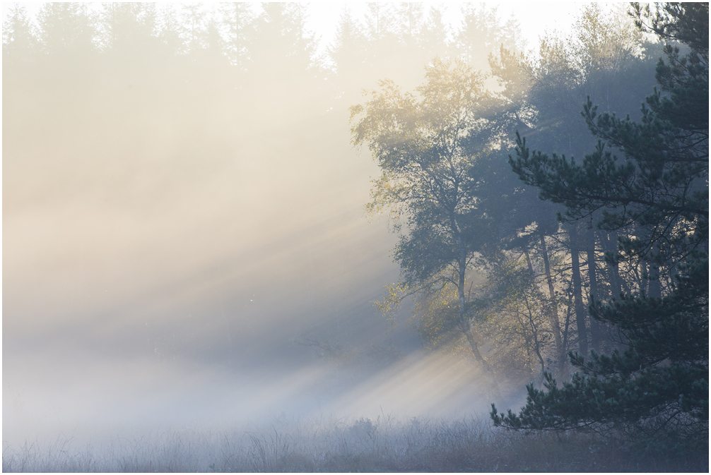 Mist met een beetje zon tijdens de herfst is voor elke natuurfotograaf een cadeautje. Uiteraard vanwege de prachtige sfeer en zonneharpen, maar ook de kleuren worden mooi zacht weergegeven doordat je de belichting wat op kunt schroeven. Daarnaast is het licht achter de bomen/bladeren lichter waardoor met name zachte tinten heel subtiel naar voren komen. Dit alles brengt een mooie balans in de foto. Op onderstaande foto kun je dat terugzien. Let op de zachtgele tinten van de berk.
