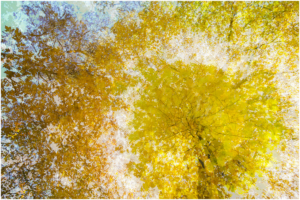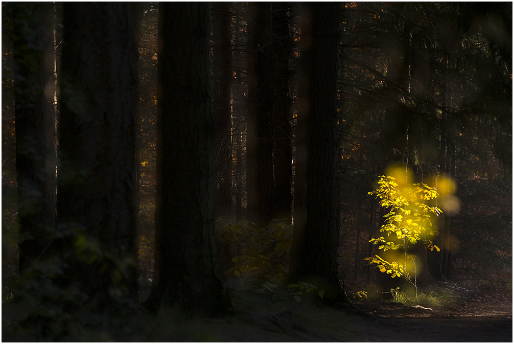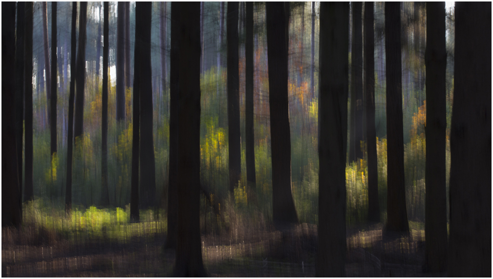 Naast mist met zijn witte achtergrond en omgeving is zwart ook een 'kleurversterker'. Naast zwart worden kleuren als geel en oranje nog intenser. Nu kan een bos vaak wat rommeliger zijn en daarom heb ik bij deze foto's gekozen voor beweging (bovenste foto) en een dubbelopname (de tweede en de derde). Hierdoor krijgt een 'harde' foto toch iets zachts wat m.i. weer beter past bij de herfstsfeer.