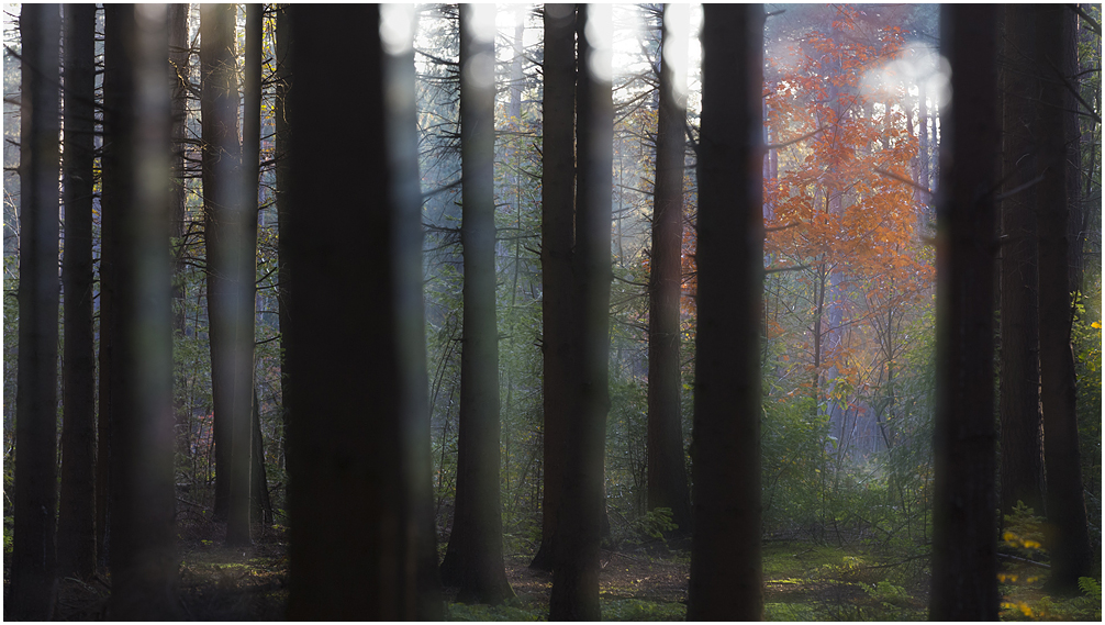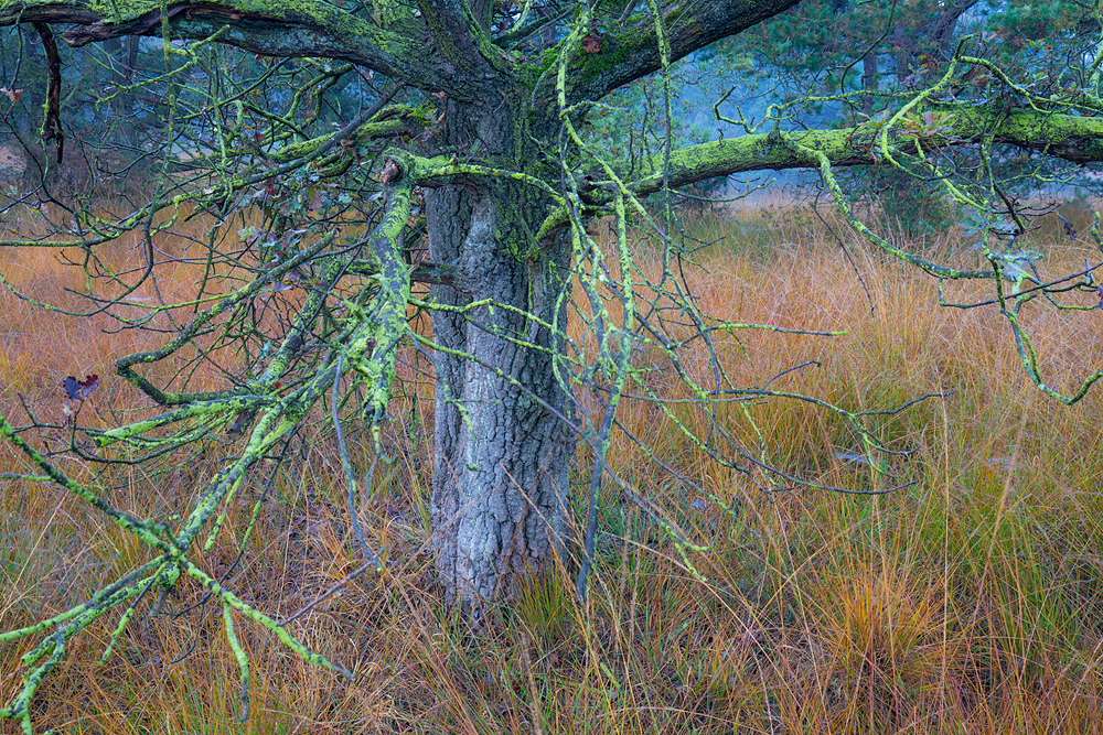 In de inleiding sprak ik al over blauw. Je kunt dan denken aan foto's met een complete blauwzweem; een effect wat je krijgt als je de witbalans op kunstlicht te zetten. Dat versterkt zeker het 'koude' gevoel van de herfst en de sfeer van het uur ná zonsondergang. Maar ik wil juist wat foto's laten zien met een meer subtiele blauwe tint. Daardoor blijven toch de herfstkleuren goed zichtbaar. In de nabewerking zet ik de witbalans handmatig een klein beetje lager (ergens tussen 4200 - 4600 graden Kelvin). Regels zijn hier niet voor; probeer vooral op je gevoel af te gaan! Vooral de stam van de dennenboom krijgt dan zo'n mooie gloed (vind ik), maar ook met wat laatste mistflarden werkt het goed.