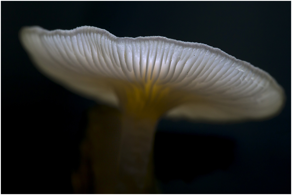 Als je wilt weten hoeveel kleur er in een paddenstoeltje zit kun je er een LED lichtje boven houden. 2 - 3 stops onderbelichten voor een donkere achtergrond en dit is het effect;