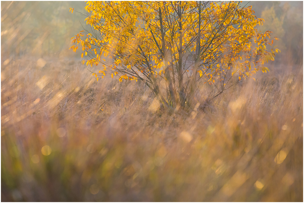 En als laatste nog een gewone 'warme' herfstfoto van een boompje op de Rucphense heide. Genomen met een EF 70-200mm, laag standpunt en grote diafragma zodat alleen de boom scherp is.