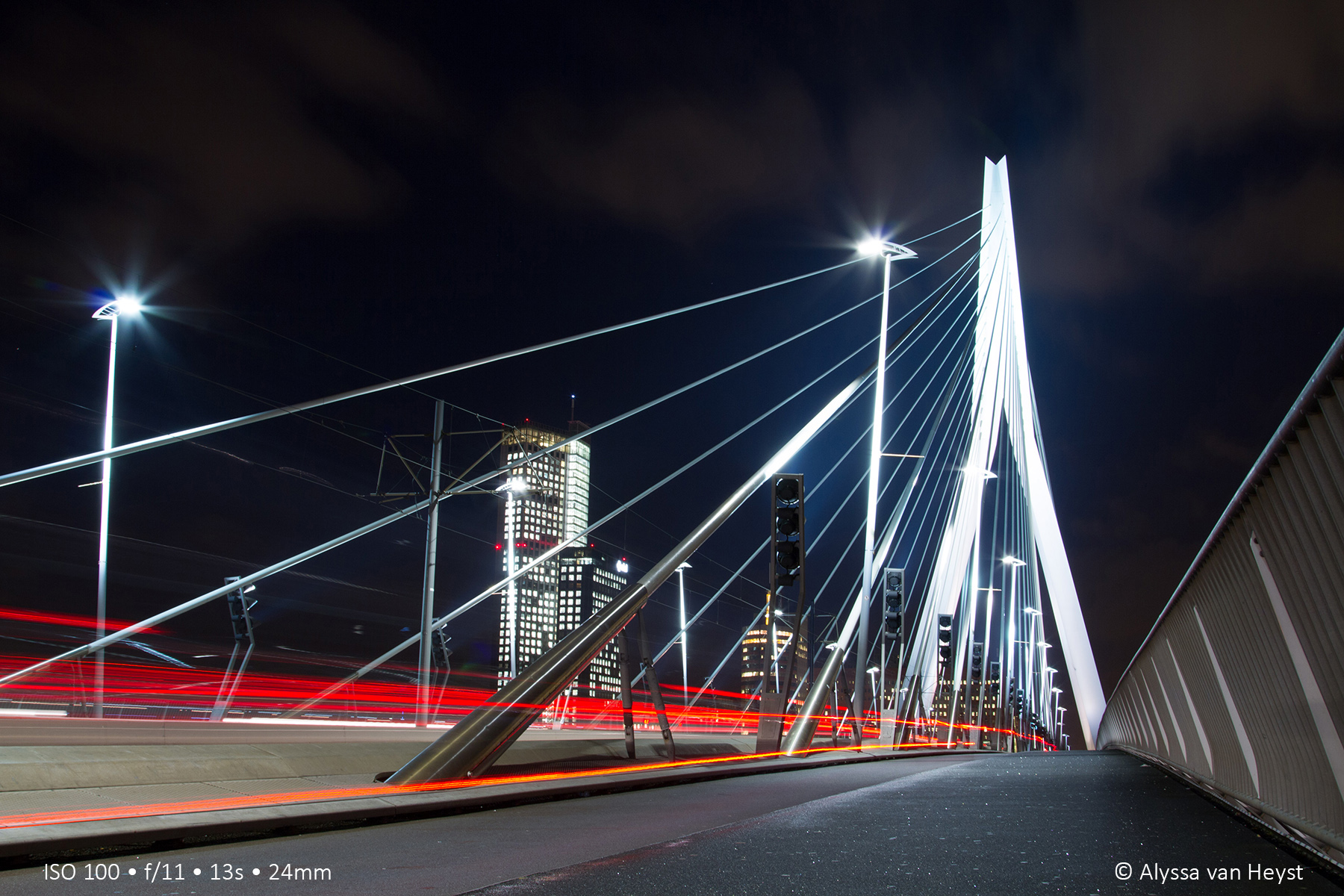 Van tevoren heb ik al wat ideeën in mijn hoofd op welke manier ik de foto wil maken. Ik zorg ervoor dat ik de foto in verschillende perspectieven maakt. De foto van de Erasmusbrug en de Eifeltoren heb ik allebei gemaakt vanuit de kikker-perspectief. Statief zo laag mogelijk, de camera wijst dan een tikkeltje omhoog (geen aanrader bij regen). Deze foto’s heb ik ook met een verticaal kader gemaakt, maar dat pakte minder immens uit dan de kikker-perspectief.