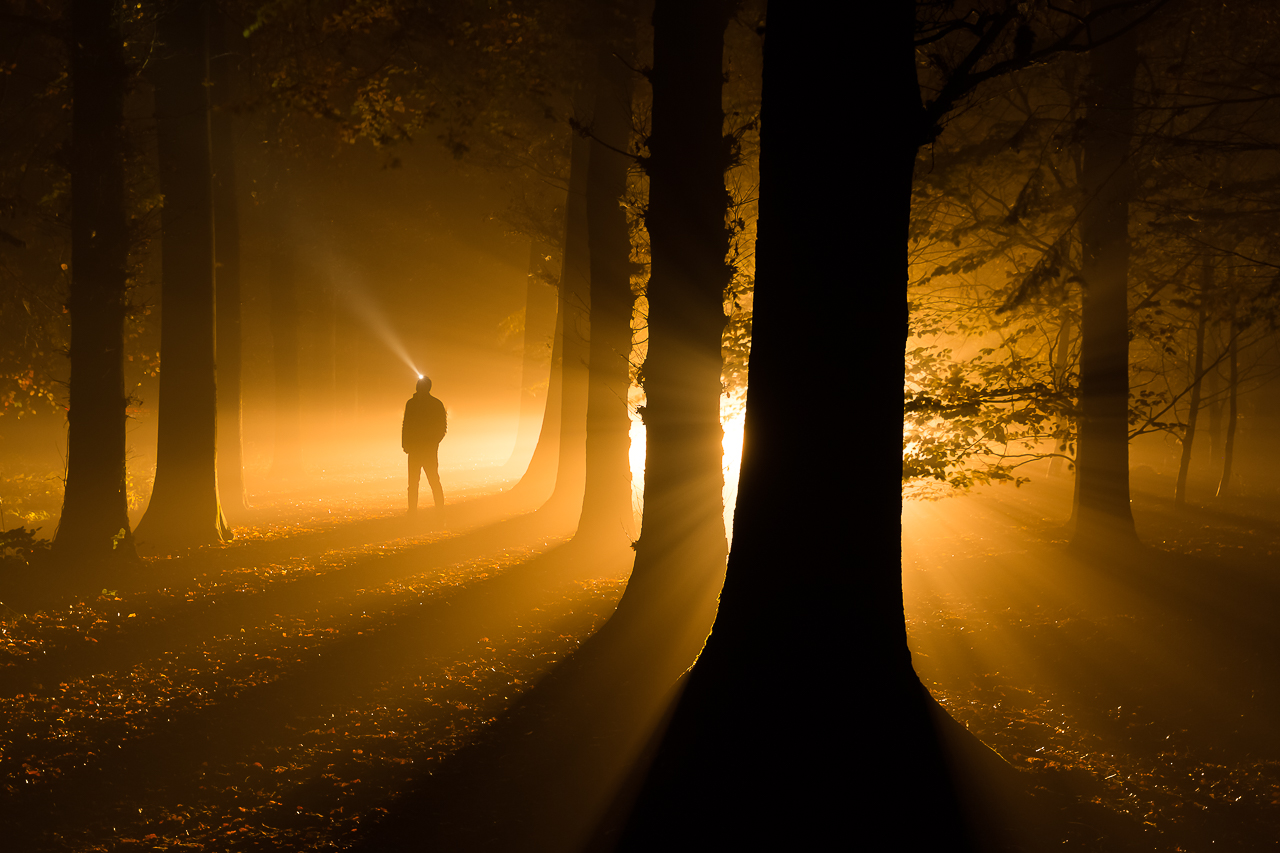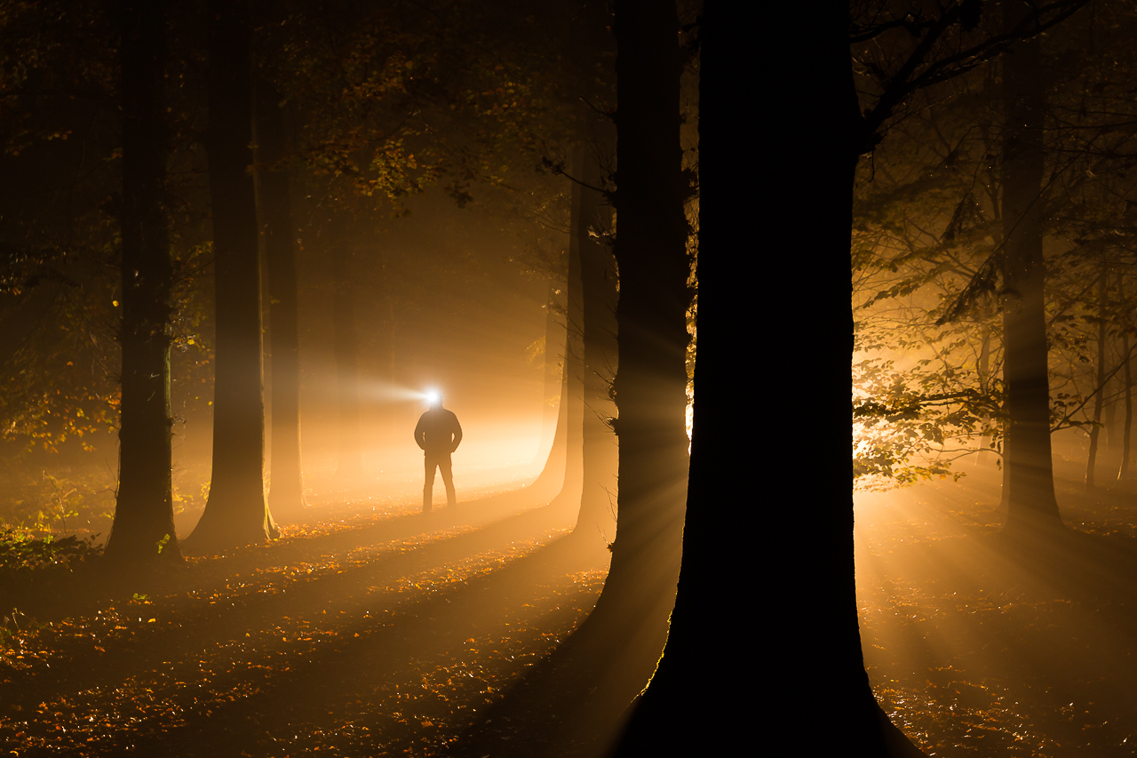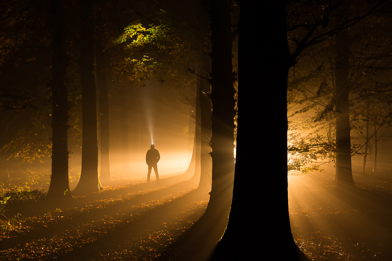 Ik liep al een aantal dagen rond met het idee. Een idee dat steeds verder vorm kreeg en er iedere keer wat concreter uit ging zien. Een idee met de duisternis van de nacht, de mystiek van de mist en licht. Ik had een foto in mijn hoofd waarbij sterk kunstmatig licht een belangrijke rol zou spelen. De koplampen van mijn 4wd zouden daarvoor ideaal zijn. Naast het kunstmatige licht zou tevens de locatie cruciaal zijn. Het moest niet alleen een locatie zijn die zou bijdragen aan de mystieke sfeer. Maar het moest ook nog een enigszins redelijke compositie hebben. Én ik moest mijn auto op een dusdanige manier kunnen plaatsen dat het licht van mijn koplampen krachtig genoeg zou zijn en bovendien in de juiste hoek zou schijnen. Zoals altijd kwam het dus weer op voorbereiding aan. Ik liep de verschillende mogelijke locaties in mijn gedachten bij langs en besloot een keuze te maken. Uiteindelijk was het zover. De nacht was zwarter dan zwart. Er hing een dichte mist over Nederland die tot diep in de bossen zou doordringen. Een bewolkte lucht zou het eventuele licht van de maan tegenhouden. Zelden heb ik het donkerder gezien. Totale duisternis. Het zicht was zelfs met een hoofdlamp slechts een meter of twee.
