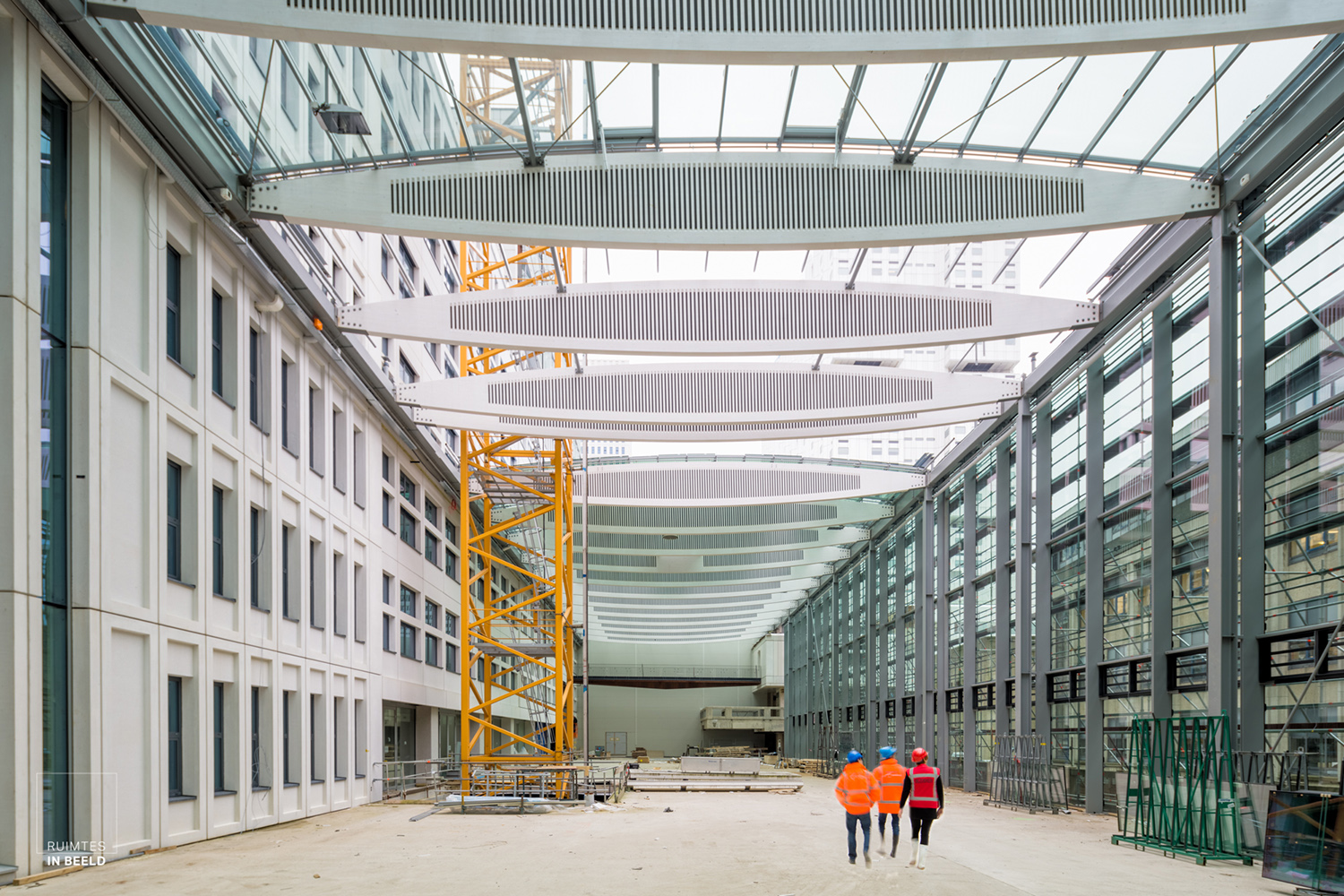 Bij een megaproject als deze bouw kom je fantastische omstandigheden tegen. Het is prachtig om een foto te maken van een ruimte die in aanbouw is, en waar middenin een kraan staat die nog dwars door het dak steekt.